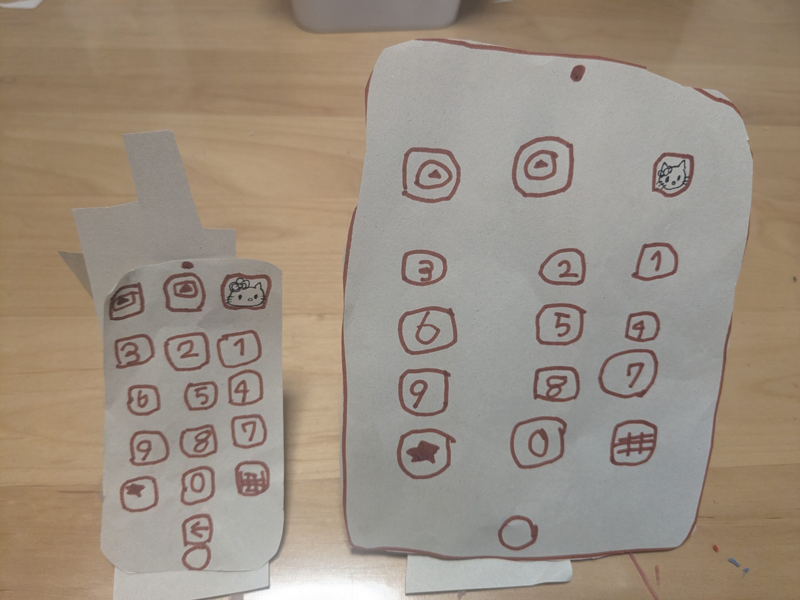 「ママラッキーハッピーエブリデイキティちゃんやってるかいて」の無茶振りに答えて描いたやつ(左) が破れてメソメソしながら真似して描いてたやつ(右)